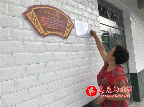 四組宋立琴一大早就拿著大掃帚清掃院落,潔凈的玻璃窗倒映著笑臉,與大門上懸掛著的“五美庭院”相得益彰。環顧四周,宋立琴周邊農戶都懸掛著同樣的“五美庭院”標識。