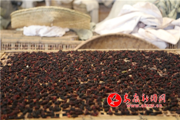 桑葚鮮果保鮮時間短,采摘后不及時銷售便會造成損失。明星村大陽蠶桑支部通過和石泉縣錦絲盛農業科技有限公司合作,采取“支部+合作社+公司+農戶”的發展模式,將一部分鮮果通過工廠加工,將銷售價格為5元每斤的新鮮桑葚精選制成桑葚干,桑葚干售價60元每斤;另一部分桑葚釀造成桑葚果酒,還有一部分桑葚可以通過蒸餾古法烤酒的方式制成白酒。以此增加桑葚的附加值,通過提升桑葚的附加值,增加農民的收入。