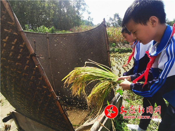 在學(xué)校老師的組織下,學(xué)生紛紛變身“小農(nóng)夫”,有模有樣地實(shí)操起來(lái),左手抓緊稻稈,右手揮舞鐮刀,只見(jiàn)一排排稻谷被割倒,整齊地?cái)[放在稻田里,另一組學(xué)生緊握稻稈,用力舉過(guò)頭頂摔打稻穗,一粒粒金色的稻谷脫稈而出,堆積在拌桶之中。孩子們忙得熱火朝天,不時(shí)傳來(lái)陣陣歡笑聲。