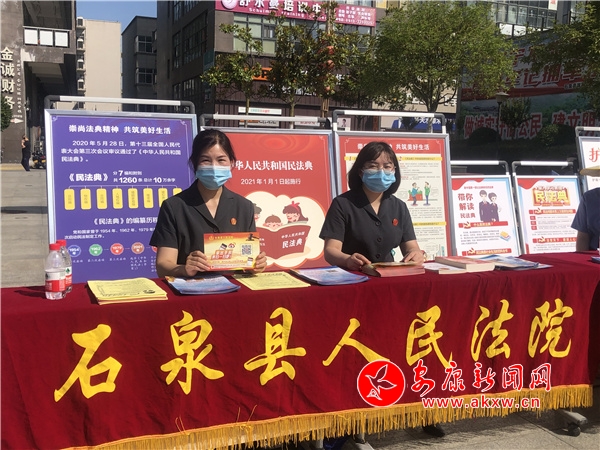 本次活動主題為“典”亮生活 法潤石泉,以增強廣大群眾對《民法典》的認識為目的,推動《民法典》走到群眾身邊,走進群眾生活。通過懸掛橫幅、擺放宣傳展板、發放宣傳手冊、現場提供法律咨詢等形式向群眾進行普法宣傳。