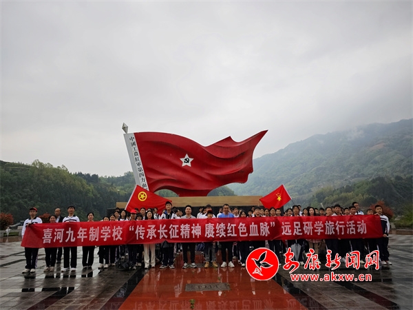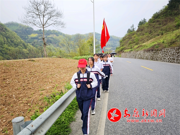 活動中,該校師生沿著公路有序行進,途中相互鼓勵打氣,順手撿走路邊垃圾,用實際行動保護家鄉的綠水青山,彰顯中學生良好的精神風貌。經過2個小時的徒步行走,師生順利到達終點喜河鎮紅色文化廣場。