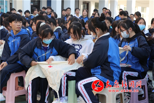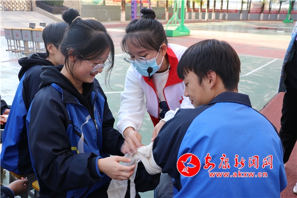 活動(dòng)中,縣紅十字會(huì)工作人員向?qū)W生發(fā)放了三角巾,現(xiàn)場向?qū)W生講解了三角巾的結(jié)構(gòu)和各部分的功能,并以手臂、肩部和胸部三個(gè)部位受傷為例做了操作示范,手把手地指導(dǎo)學(xué)生如何包扎、如何敷料、如何固定、如何打結(jié)。同學(xué)們邊觀察邊實(shí)操,不時(shí)和工作人員進(jìn)行互動(dòng),尋求專業(yè)指導(dǎo),親手體驗(yàn)三角巾包扎的操作流程,在鍛煉動(dòng)手實(shí)踐能力的同時(shí),掌握身體受傷的應(yīng)急處理技能,增強(qiáng)應(yīng)對突發(fā)事件的自護(hù)自救和科學(xué)救護(hù)能力。