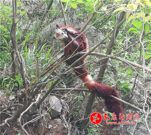 石章明第一時間聯(lián)系了縣林業(yè)局,工作人員立即趕到護(hù)林站,看見這個小動物全身毛色發(fā)亮,棕紅色與白色相間,拖著一條酷似松鼠一樣的大尾巴,頭又圓又小,眼睛大,眼圈赤栗色,體長1米多,尾巴長度超過體長。經(jīng)過現(xiàn)場查看、圖片比對,并和市林業(yè)局聯(lián)系,最終確認(rèn)這就是國家有益、有重要經(jīng)濟(jì)、有科學(xué)研究價值的“三有”保護(hù)野生動物——飛狐。隨即,林業(yè)工作人員對這只飛狐進(jìn)行了全面體檢救治。