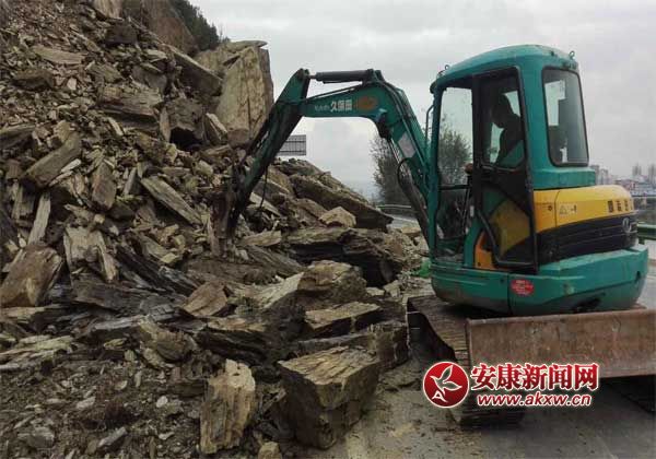 安康新聞網(wǎng)訊 (通訊員 葛松 張歡) 10月29日上午,瀛湖干道K1+050處,一臺挖掘機(jī)一臺裝載機(jī)正在緊張清除道路塌方。vsq安康新聞網(wǎng)