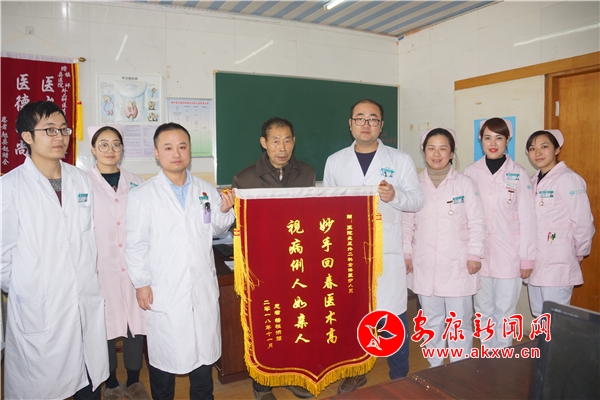 安康新聞網(wǎng)訊(通訊員 杜波兒 鄒發(fā)華)11月28日,家住小曙河中壩7組的患者楊桂洪,將一面寫有“妙手回春醫(yī)術(shù)高,視病倒之人如親人”金色大字的錦旗贈(zèng)給了鎮(zhèn)坪縣醫(yī)院外二科,并不停舉起大拇指稱贊醫(yī)護(hù)人員了不起,給了他第二次生命。