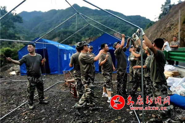 這支隊伍到達現場后,立即組織轉移受災群眾、轉移物資、搭建帳篷......他們的到來極大地增強了受災群眾的信心,軍民一心,團結抗災,一場緊急而有序的搶險行動迅速展開。