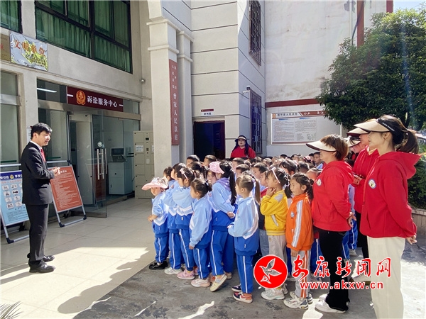 在參觀過程中,干警帶領同學們走進訴訟服務中心和干警辦公室了解了法院干警的工作場所。隨后,帶領同學們參觀審判庭,現場向同學們介紹科技審判法庭的功能及庭審流程,并展示了法袍、法槌和法徽,同時用深入淺出的語言和提問互動的方式向孩子們講解了法袍、法槌和法徽的象征意義,同學們興趣濃厚,紛紛走上審判臺,親身感受和觸摸審判設施,感受法庭審判的嚴肅和莊重。
