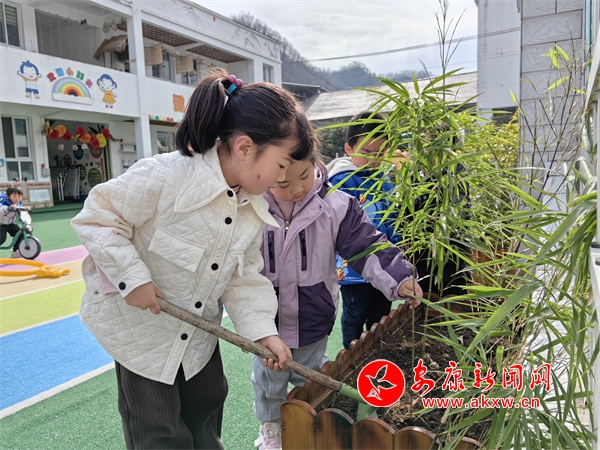 鎮坪縣上竹鎮幼兒園周圍山區有大面積的竹林,竹子也是當地人生活中常見的植物。為了讓孩子有更多的探索資源,將種植區得以延伸,幼兒園開發利用了操場的角落種竹子,老師和孩子們一起閱讀了繪本故事《小竹筍長啊長》,了解了竹子的生長過程,利用家園合作的契機,收集了當地的竹苗。