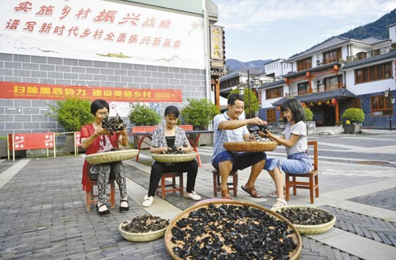 (七月三十一日, 在鎮坪縣聯合村的巴山臘味小鎮,村民楊大兵(右二)與家人正在清洗巖耳。巴山臘味小鎮是陜西省十二個農村特色產業小鎮之一,每年吸引不少省內外……