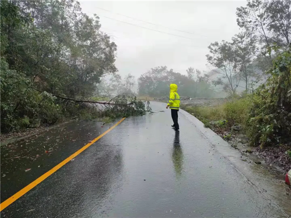 310省道38KM+800M因大雨造成大樹倒塌占據半幅道路。