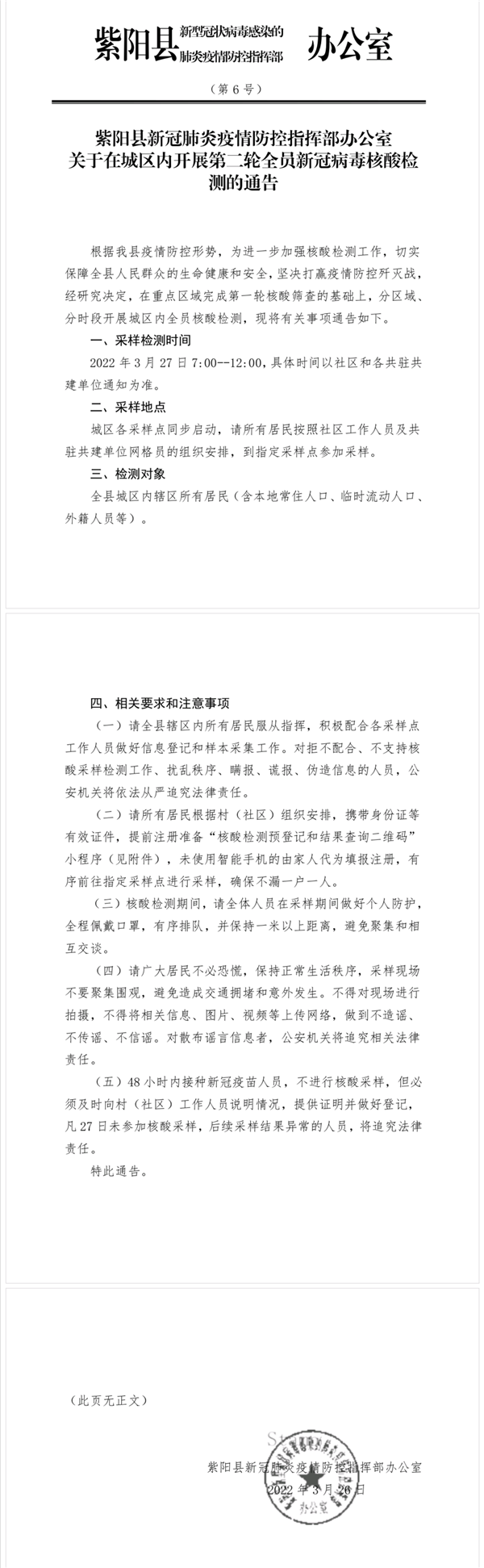 通告!紫陽縣在城區開展第二輪全員新冠病毒核酸檢測