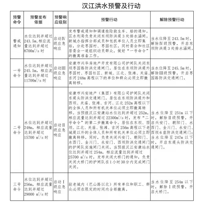 根據《安康市人民政府關于印發安康城區防汛抗洪預案的通知》有關漢江洪水預警及行動的內容: