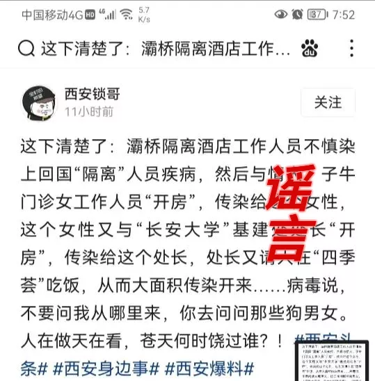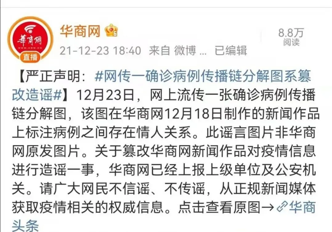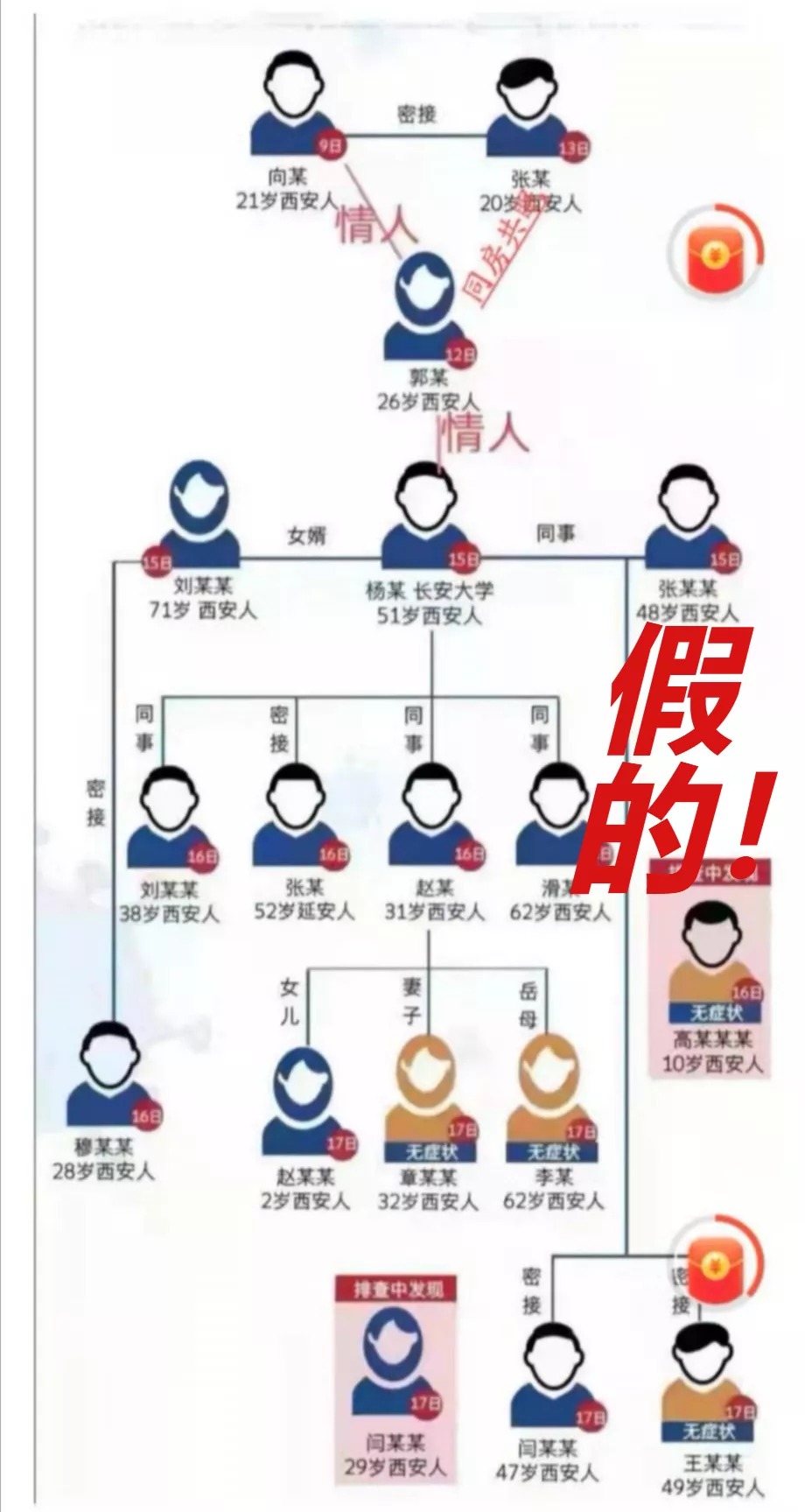 網上流傳一張確認病例傳播鏈分解圖,在病例之間標注“情人”關系,并傳言此次疫情傳播因素之一,是因為西安首例病例與子牛門診的護士為情人關系,導致疫情擴散,經核實,該圖盜用華商網12月18日制作的新聞作品圖片。該信息為虛假信息,造謠的人已被拘留。ZVg安康新聞網