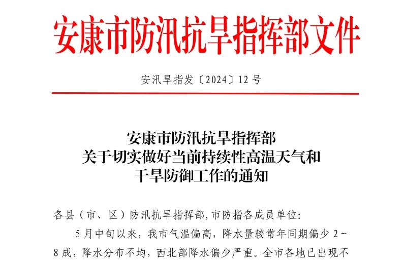 6月12日,安康市防汛抗旱指揮部發布《關于切實做好當前持續性高溫天氣和干旱防御工作的通知》。