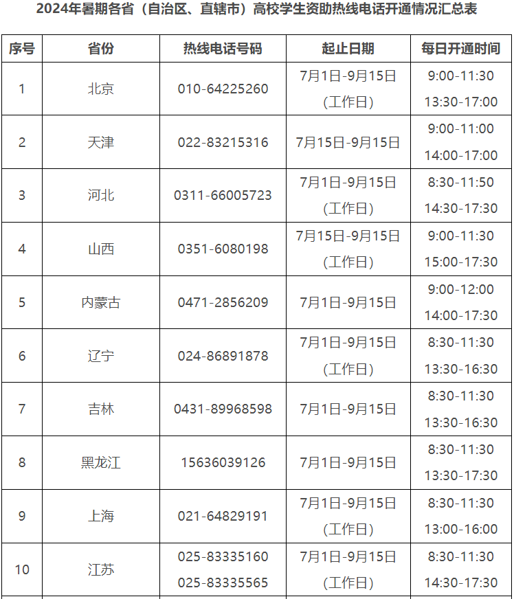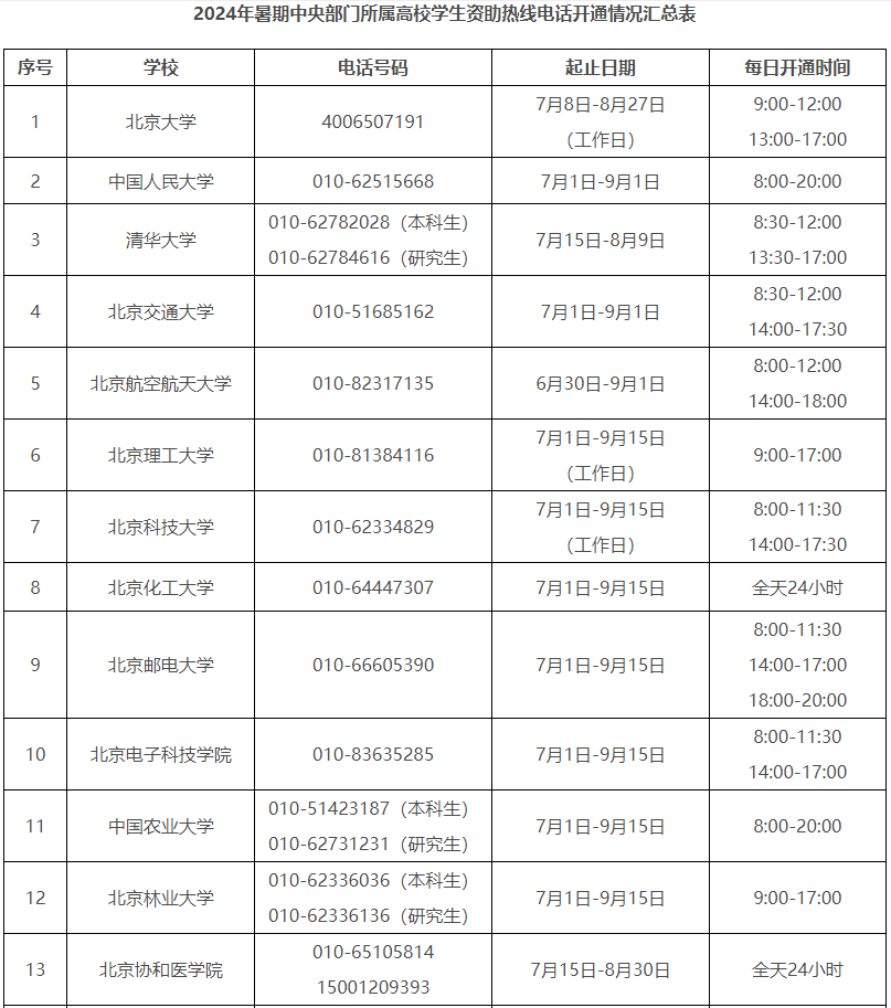 今年暑期,教育部將繼續開通高校學生資助熱線電話,號碼為010—66097980、010—66096590,受理時間為7月1日—9月15日,每天8:00—20:00,為大學新生特別是家庭經濟困難的大學新生提供資助政策咨詢與幫助。