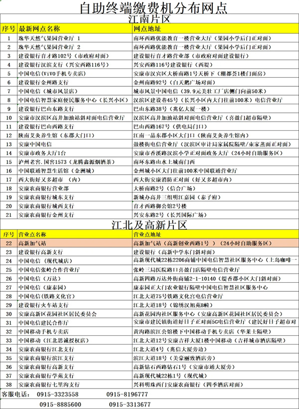 為進(jìn)一步方便廣大用戶購(gòu)買(mǎi)天然氣,我公司在電信營(yíng)業(yè)廳、建設(shè)銀行、農(nóng)商銀行及便民服務(wù)點(diǎn)等網(wǎng)點(diǎn)布設(shè)38臺(tái)天然氣自助終端繳費(fèi)機(jī)。現(xiàn)溫馨提示您關(guān)注“安康市逸華天然氣有限公司”微信公眾號(hào)查看自助機(jī)分布網(wǎng)點(diǎn),選擇就近網(wǎng)點(diǎn)進(jìn)行天然氣充值。其他業(yè)務(wù)可在工作時(shí)間內(nèi)前往以下人工服務(wù)大廳或窗口辦理,部分業(yè)務(wù)也可通過(guò)微信公眾號(hào)的“微營(yíng)業(yè)廳”辦理: