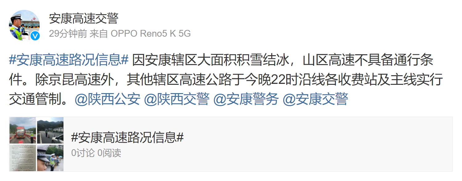據(jù)安康高速交警消息:因安康轄區(qū)大面積積雪結(jié)冰,山區(qū)高速不具備通行條件。除京昆高速外,其他轄區(qū)高速公路于今晚(2月22日)10時沿線各收費(fèi)站及主線實行交通管制。 2sn安康新聞網(wǎng)