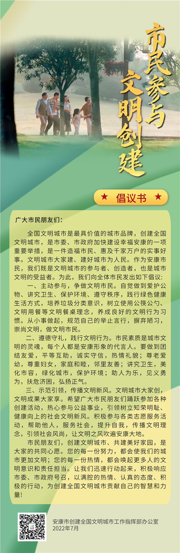 三、示范引領(lǐng),傳播文明新風(fēng)。文明城市大家創(chuàng),文明成果大家享。希望廣大市民朋友們踴躍參加各種創(chuàng)建活動,熱心參與公益事業(yè),引領(lǐng)樹立知榮明恥、健康向上的社會文明新風(fēng)。積極參與各類志愿服務(wù)活動,幫助他人,服務(wù)社會,提升自我,傳播文明理念,引領(lǐng)社會風(fēng)尚,讓文明之風(fēng)吹遍安康大地。