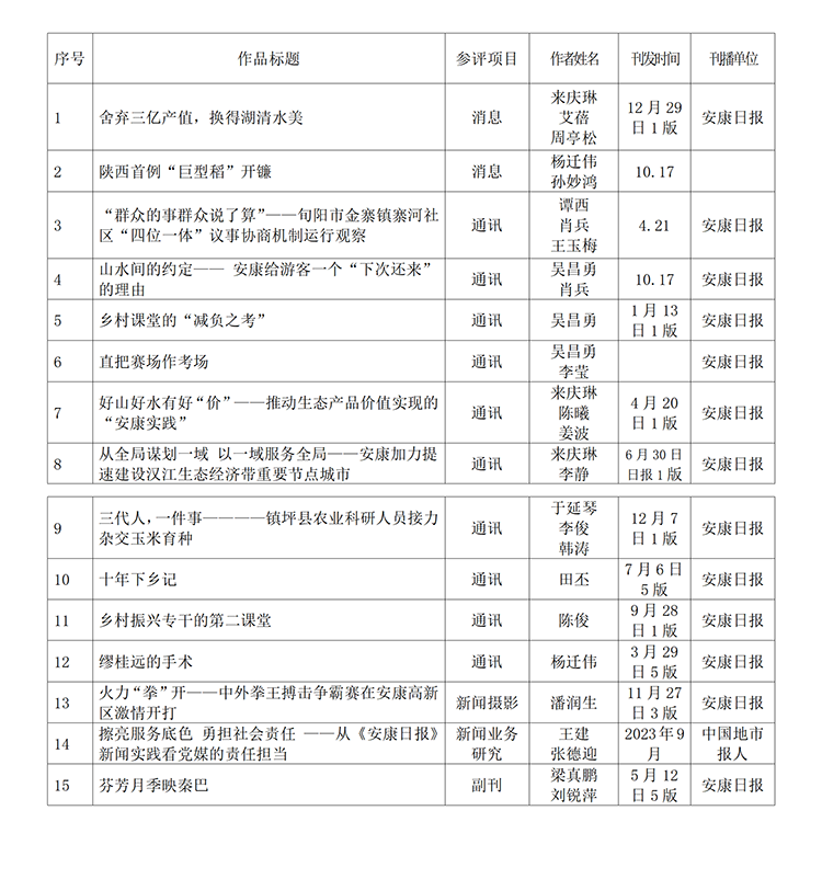 經(jīng)過1月30日編委會推薦、社黨委研究決定,擬推薦以下15件新聞作品參評2023年度“陜西新聞獎”。公示時間從2024年3月6日至2024年3月12日,公示期為5個工作日。如有不同意見,請向安康日報社機關(guān)紀(jì)委、新聞管理部反映。RQa安康新聞網(wǎng)