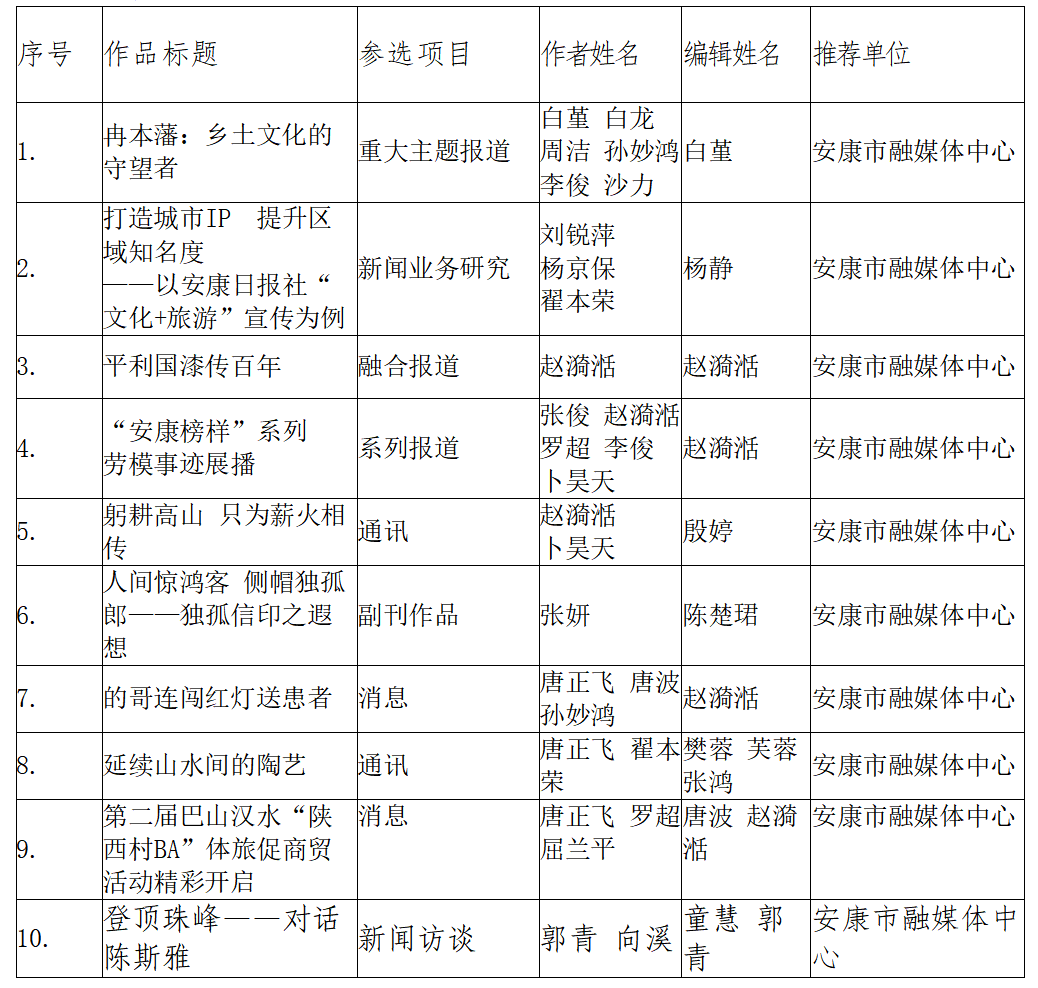 附件:安康優(yōu)秀新聞作品報(bào)送目錄(補(bǔ)充)(共計(jì)10件)xjM安康新聞網(wǎng)