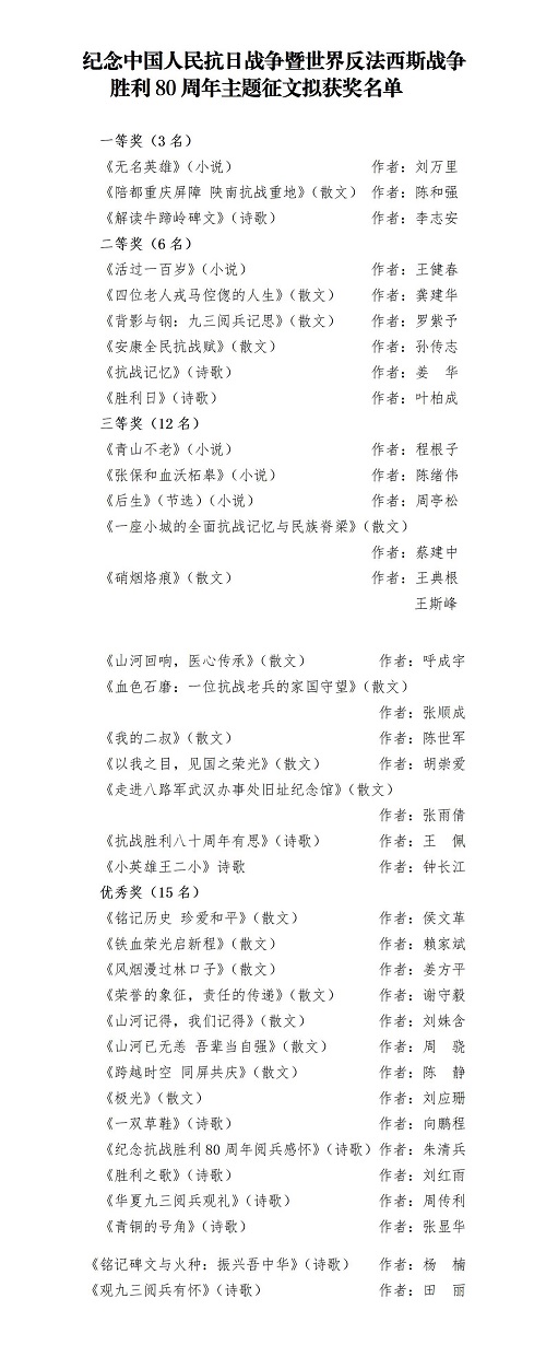 紀念中國人民抗日戰爭暨世界反法西斯戰爭勝利80周年主題征文評審結果公示