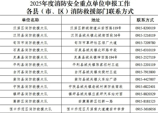 為進一步規范全市消防安全重點單位的監督管理工作,推動單位落實消防安全主體責任,根據《中華人民共和國消防法》《陜西省消防條例》《機關、團體、企業、事業單位消防安全管理規定》《陜西省消防安全重點單位界定標準》等法律法規的有關規定,按照“應列盡列”的標準,凡符合下列界定標準的單位,應主動向當地消防救援部門申報,經審查核定后,確定為消防安全重點單位,現將申報2025年度消防安全重點單位工作公告如下: