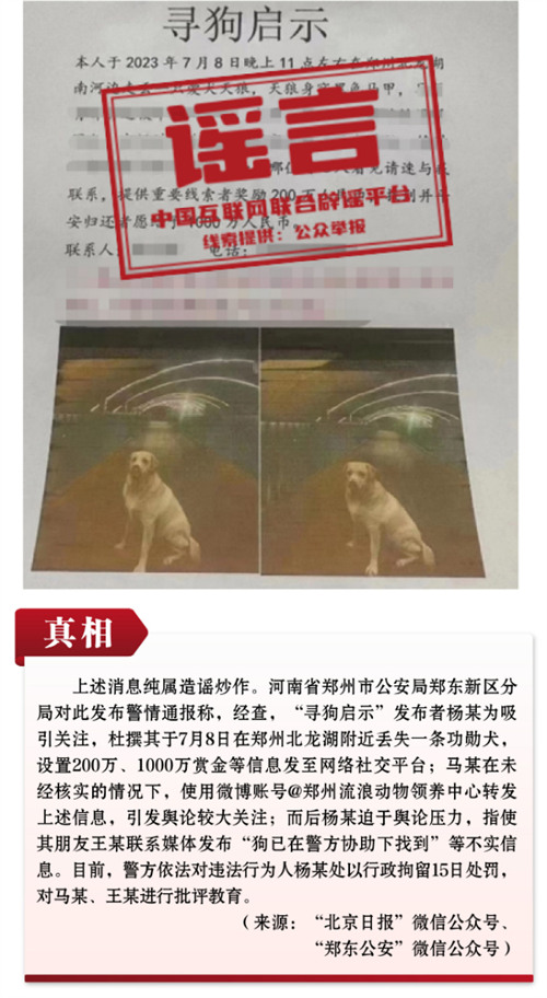 謠言9:鄭州有人懸賞1000萬尋找丟失愛犬?