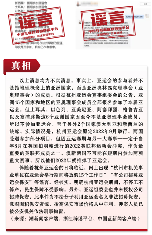 謠言6:八個國家宣布不參加杭州亞運會?杭州因舉行亞運會將于9月10日至25日放假?