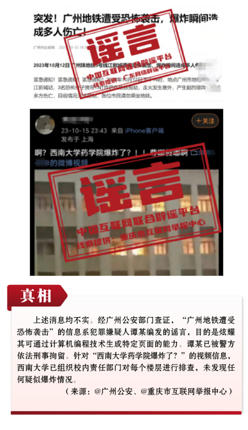 濫用AI技術造謠值得警惕。個別網民為博眼球、蹭流量,蓄意編造傳播聳人新聞,觸碰法律紅線。10月份網傳多起所謂的“爆炸事故”、惡性刑事案件,事后均被證實為網絡謠言。如利用編程和AI技術編造“廣州地鐵遭受恐怖襲擊”“安徽涇縣發生校園傷人事件,多人傷亡”等惡性謠言,憑空捏造“西南大學藥學院發生爆炸”“河北保定化糞池爆炸致1死5重傷”等虛假信息,制造社會恐慌。在“三人成虎”的傳播效應之下,網民若不明就里、輕易相信,就會成為謠言傳聲筒,造成不良社會影響。
