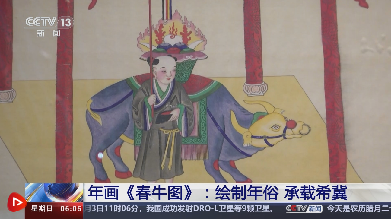 《春牛圖》也稱為《句芒神牛圖》,這幅《春牛圖》繪制于清光緒五年,圖中春牛和句芒神的位置和顏色均與當(dāng)年的五行干支相關(guān)。在清代,每逢立春時(shí)節(jié),順天府都會向皇家獻(xiàn)上《句芒神牛圖》用于迎春儀式。它不單是一幅畫,更承載著人們對于新的一年風(fēng)調(diào)雨順、喜獲豐收的美好愿望。