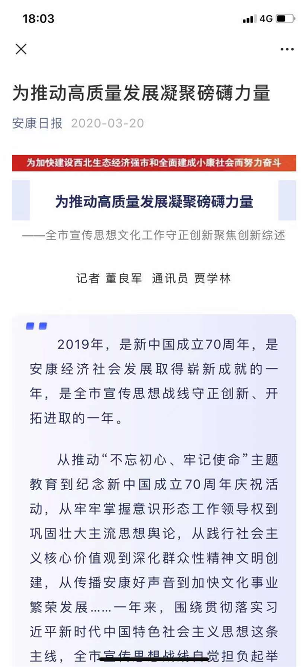 積極踐行和弘揚“四個自信”,在安康日報微信公眾號發(fā)布地方發(fā)展各行業(yè)多角度綜述文章、深度評論,以及干部職工干事創(chuàng)業(yè)的典范事跡。《為推動高質(zhì)量發(fā)展凝聚磅礴力量》《“擔當作為”“干事創(chuàng)業(yè)”……這些榮譽他們值得》《后浪推著前浪走,青年推著時代走》等作品,全面展現(xiàn)國家富強、人民幸福和社會和諧的中國夢圖景。