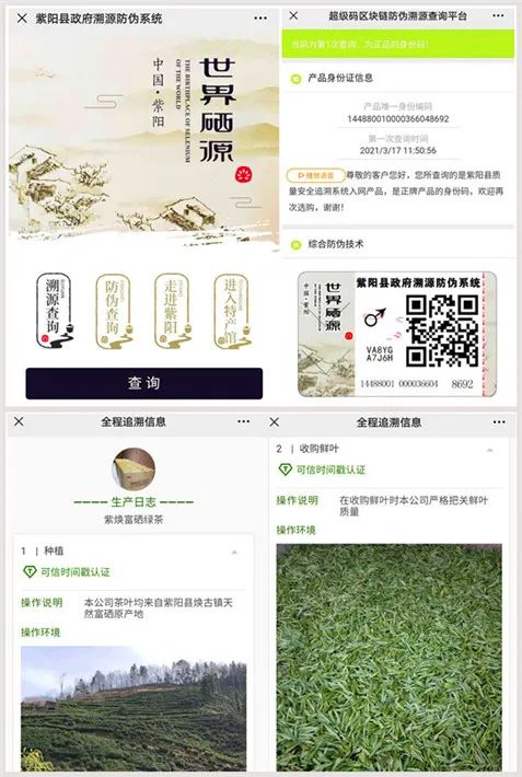 紫陽縣建立了紫陽茶溯源系統(tǒng),利用區(qū)塊鏈、一品一碼等技術(shù),為紫陽茶制作獨(dú)一無二的溯源檔案,生成唯一的溯源二維碼,通過手機(jī)掃描產(chǎn)品包裝上的二維碼,即可快速通過圖片、實(shí)時(shí)監(jiān)控視頻等方式,查看紫陽茶從茶園、生產(chǎn)加工、檢測(cè)等全程溯源檔案信息。