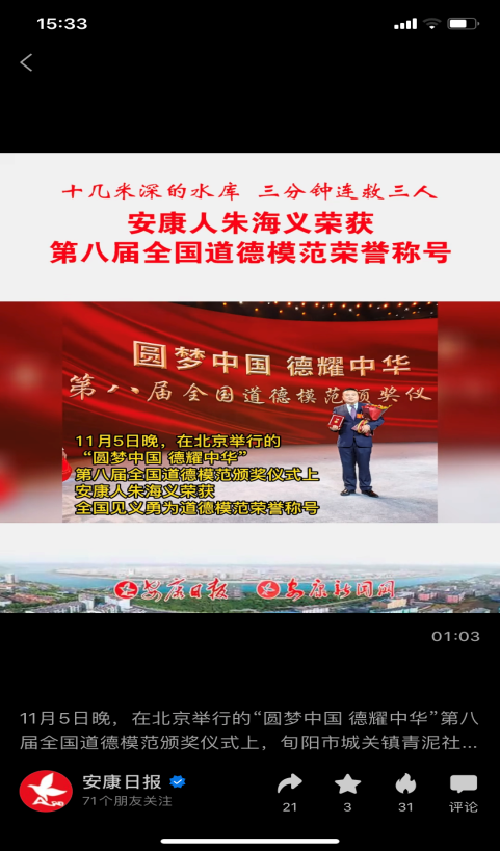 安康日報微信視頻號發布“第八屆全國道德模范朱海義”