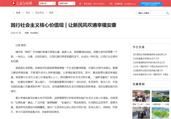 安康新聞網大力宣傳和踐行社會主義核心價值觀,大力宣傳中國夢,全媒體開設“社會主義核心價值觀”“新時代 新經典”“我們的中國夢 文化進萬家”等專欄,刊出《黨員干部要帶頭踐行核心價值觀》《讓新民風吹遍幸福安康》《漢濱區市場監管局:用心培育“文明花”》等一批重點稿件,正黨風、淳民風、興家風、樹新風,宣傳人民群眾為實現中國夢而奮勇拼搏的事跡,讓社會主義核心價值觀深入人心。ai5安康新聞網