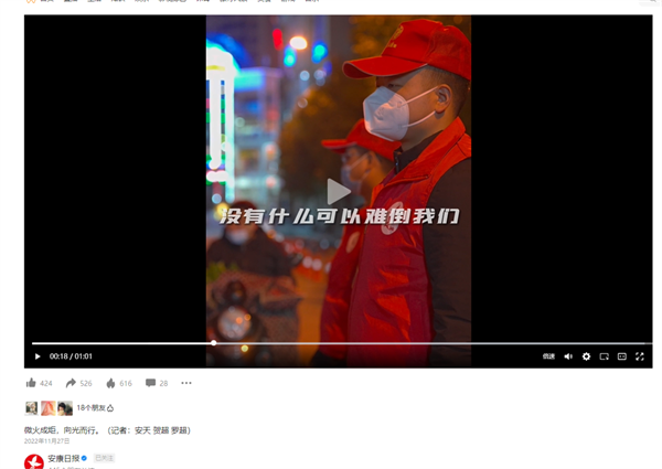 利用視頻號、抖音、微信等矩陣平臺,采編發布《“下”到一線 “沉”出擔當》《干部下沉“疫線” 志愿服務綻光彩》《致敬!堅守防疫一線的最美逆行者》等一批鮮活的現場短視頻新聞20余件,生動展示抗疫一線的管控動態、志愿服務、文明實踐以及廣大干群奮戰一線的典型事跡等;同時精心策劃制作《微火成炬 向光而行》《致敬“逆行者” 安康加油!》《眾志成城 攜手抗疫——市民說防疫》等宣傳片,及其他科普性短視頻8件,文圖聲視融合,發揮跟帖評論作用,開展轉發、評論、點贊等微互動,積極營造強信心、暖人心、聚民心的網上輿論氛圍,凝聚起共克時艱的精神動力。ai5安康新聞網