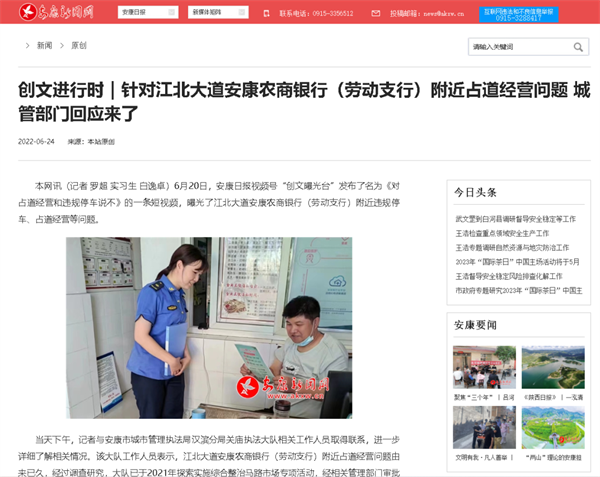 安康新聞網履行媒體輿論監督職能,聚焦民生熱點,開辦《創文曝光臺》輿論監督專欄,對不文明現象進行曝光揭露,發布批評性報道60余篇,微信視頻號采寫制作曝光類視頻稿件10余件,為提升市民文明素質和城市文明程度,貢獻媒體力量。同時積極開展調查性報道,追蹤事件真相,發布《創文進行時|針對江北大道安康農商銀行(勞動支行)附近占道經營問題 城管部門回應來了》等一批原創新聞,反映群眾呼聲,推進問題解決,體現地方黨媒的責任與擔當。ai5安康新聞網