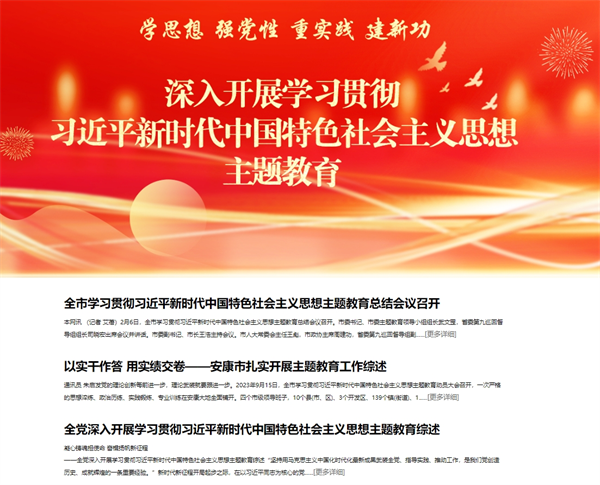 二是圍繞“深入開展學習貫徹習近平新時代中國特色社會主義思想主題教育”。安康新聞網認真統籌謀劃,深入開展學習貫徹習近平新時代中國特色社會主義思想主題教育宣傳報道工作。網站及時推出“深入開展學習貫徹習近平新時代中國特色社會主義思想主題教育”專欄,介紹我市、各縣(市、區)及單位部門組織開展主題教育的經驗做法。
