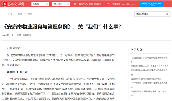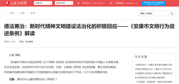 2023年,安康新聞網站準確刊播政策消息,保證了政務消息、惠民消息及時準確地傳播。發揮黨媒資源優勢,準確闡釋解讀市委、市政府的重要決策和惠民政策,刊出《德法兼治:新時代精神文明建設法治化的積極回應——〈安康市文明行為促進條例〉解讀》《安康市2023年義務教育階段學校招生入學政策解讀》,從群眾關切入手,提升媒體服務質量和為民服務意識。
