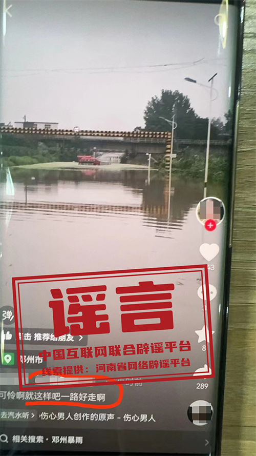 7月15日,網民“神x”在某短視頻平臺發布“貨車司機被淹”視頻,并配文稱“可憐啊,就這樣吧,一路好走”。經核實,7月14日,鄧州市鐵路橋下一外地牌照貨車被淹,車內被困人員已被成功救出,無人員傷亡,該信息與事實嚴重不符,系虛假信息。