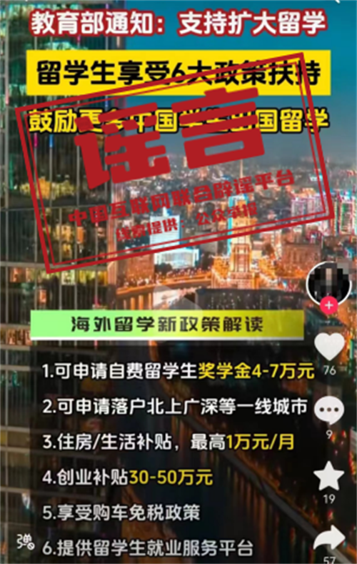 詳情:近日,有自媒體在多個網絡平臺發布視頻,稱“教育部留學中心召開發布會宣布‘將擴大支持留學,留學生將享受申請自費留學獎學金、申請落戶一線城市等六大政策扶持’等留學新政策”。對此,教育部留學服務中心7月29日鄭重聲明:該視頻虛假不實,我中心從未召開此發布會,從未發布過相關政策。所謂六大政策支持,主要是對部分地方有關政策的拼湊和夸大。請廣大留學生及公眾提高警惕,謹防上當受騙。對此類造謠炒作行為,我中心保留追究相關方法律責任的權利。(來源:“教育部留學服務中心”微信公眾號)