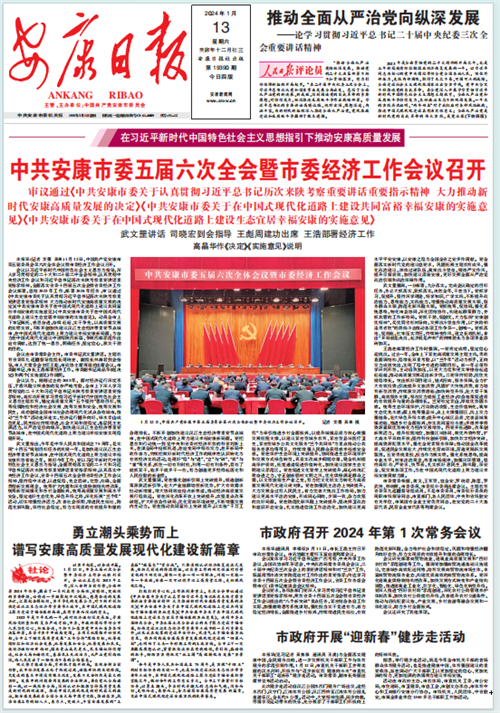 (2024年1月13日安康日報01版報道“中共安康市委五屆六次全會暨市委經濟工作會議召開”)