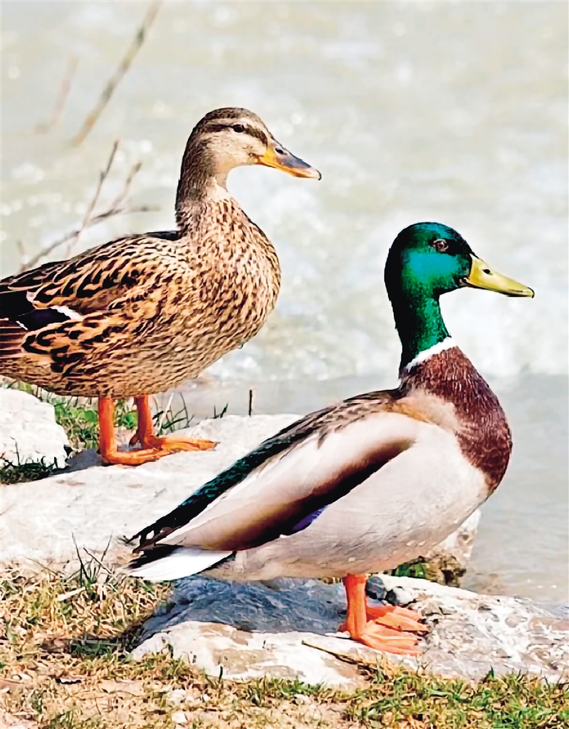 又名野鴨。雄鳥頭綠色,有一白色領(lǐng)環(huán),胸栗色,翼鏡藍(lán)綠色,尾上、下覆羽黑色,嘴黃綠色,腳橙紅色;雌鳥嘴橙黃色,貫眼紋黑褐色,全體褐色,有暗褐色斑紋。(來源:安康市林學(xué)會)aQ4安康新聞網(wǎng)