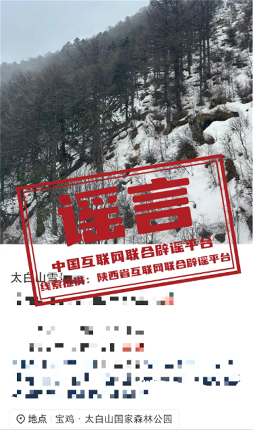 真相:近日,有網(wǎng)民發(fā)帖稱“陜西太白山迎來今秋第一場大雪”,并曬出視頻畫面,山林間白雪紛飛,屋檐上覆蓋著薄雪。相關(guān)視頻引發(fā)關(guān)注,有網(wǎng)民表示立即前往景區(qū)賞雪。對此,景區(qū)工作人員回應(yīng)稱,網(wǎng)傳視頻為往年下雪場景,目前太白山正在下大雨,景區(qū)已經(jīng)關(guān)閉。提醒游客出行前應(yīng)關(guān)注景區(qū)的實時公告與天氣情況,以免受虛假信息誤導(dǎo)。(來源:陜西省互聯(lián)網(wǎng)聯(lián)合辟謠平臺、@上游新聞)
