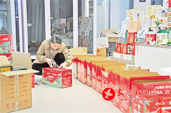 春節臨近,紫陽蒸盆子和年貨大禮包通過電商走進了萬戶百姓家。目前已銷售紫陽蒸盆子4萬份,年貨大禮包1000余份。圖為工作人員在打包發貨。彭召伍 攝cyt安康新聞網