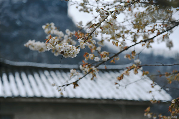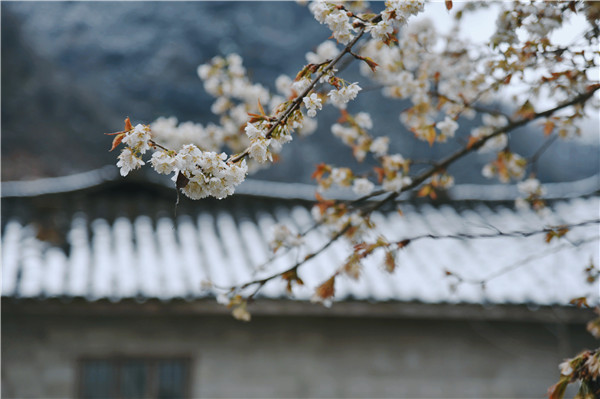 2月25日,石泉縣迎來了新年的第一場雪,高山處的村莊變得銀裝素裹,農家小院旁的櫻花開滿枝頭,潔白的櫻花與雪花共舞,為新年增添了更多的樂趣。(儲招賢 攝)