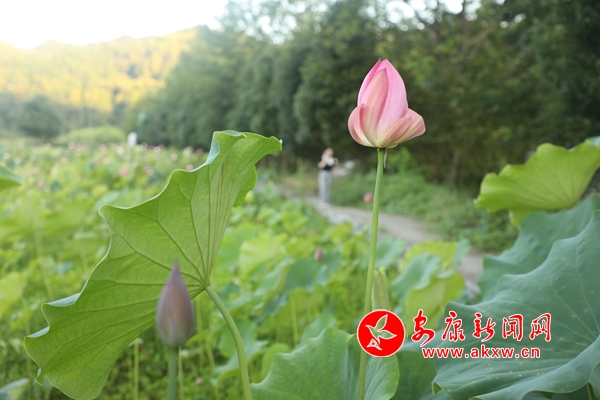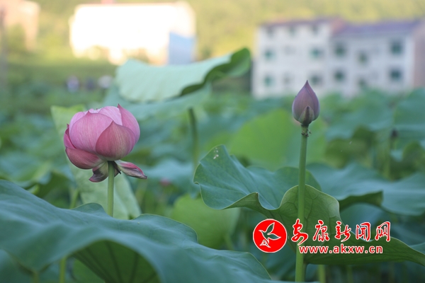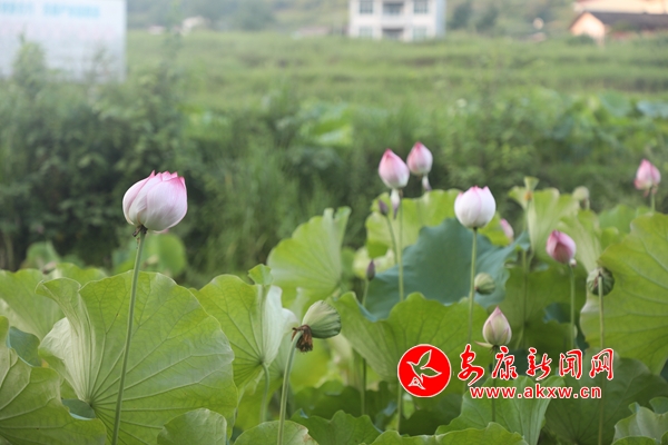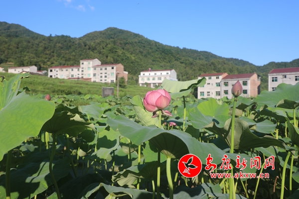 荷葉碧綠,荷花盛開。在七月驕陽的照耀下,伴隨著鳥叫和蟬鳴,漢濱區沈壩鎮花紅村的灼灼荷花如期而至,與美麗鄉村形成一道靚麗的獨特風景。(鄭時根 攝)
