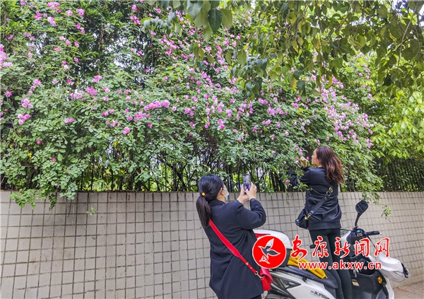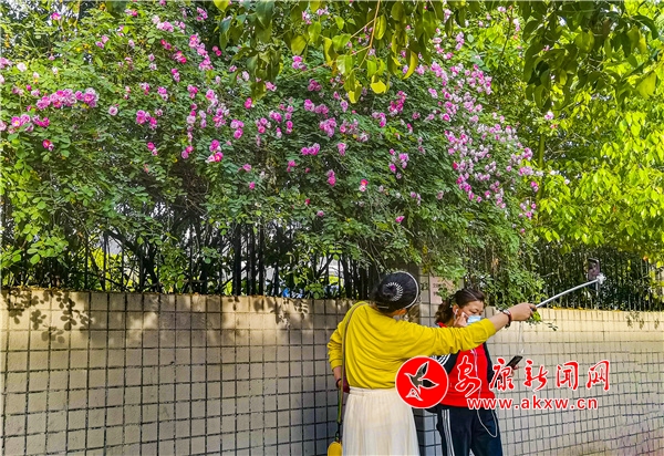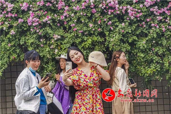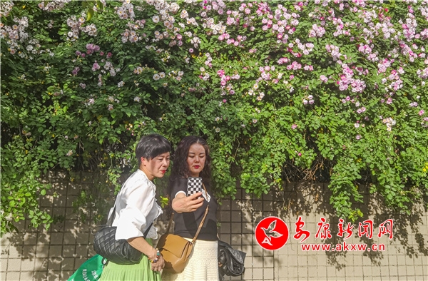 近日,安康東堤外的漢寧宮院墻上的薔薇花盛開,成了安康的網紅打卡地,每天吸引了數百人到此賞花拍照。(圖文/陳德模)