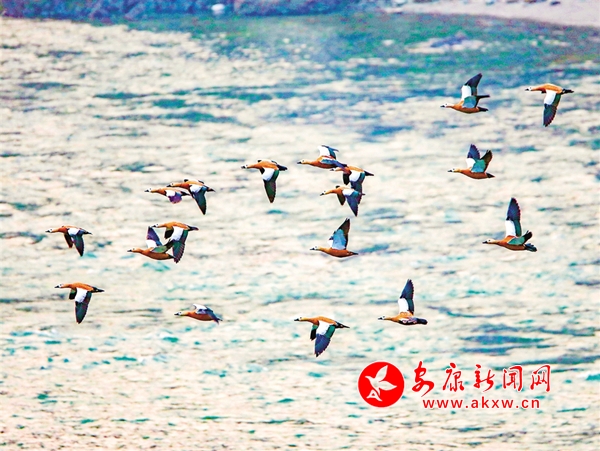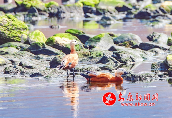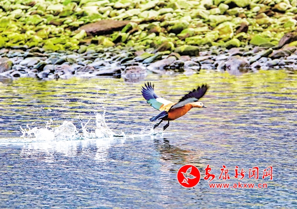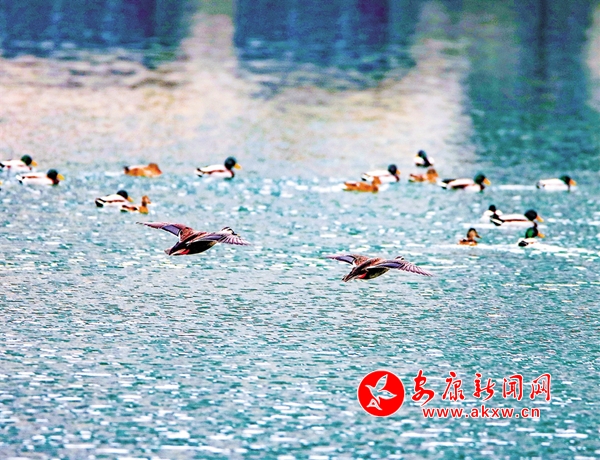通過攝影鏡頭觀察發現,在大片野鴨群中有綠頭鴨、斑嘴鴨、赤麻鴨等數10個種類。它們在這里和諧相處,像一個個小精靈悠閑自得。一群群野鴨在河里時而相互追逐,時而潛水覓食,一會兒游上岸邊休息,一會兒展翅飛翔劃過湛藍的天空,一幅人與自然和諧共生的美麗畫卷在石泉徐徐展開。