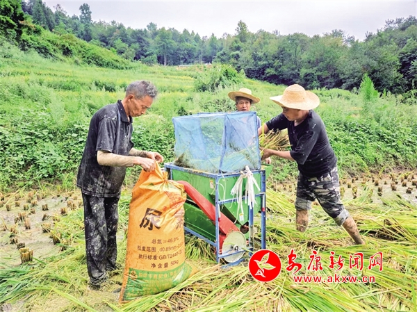 連日來(lái),高溫天氣持續(xù),漢濱區(qū)吉河鎮(zhèn)吉河壩社區(qū)大片水稻已經(jīng)成熟,農(nóng)戶搶抓晴好天氣開(kāi)鐮收割,一派繁忙的豐收景象。該區(qū)40萬(wàn)畝秋糧作物開(kāi)鐮收獲以來(lái),農(nóng)業(yè)農(nóng)村部門(mén)先后組織調(diào)運(yùn)2000余臺(tái)(套)收割、脫粒等農(nóng)機(jī)參與秋收工作。李勝福 攝