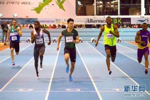 ↑2月13日,中國(guó)選手蘇炳添(中)在預(yù)賽中沖刺。 當(dāng)日,在愛爾蘭阿斯隆舉行的室內(nèi)大獎(jiǎng)賽中,中國(guó)短跑名將蘇炳添以6秒52的成績(jī)?cè)谀凶?0米比賽中奪冠并打破賽會(huì)紀(jì)……